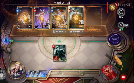 当你刷新商店时,可能会出现刷新出来的卡牌宝石不够,下回合又会自动刷新一轮商店,这时候可以选择点击下图红色框内图标进行锁定卡池,锁定卡池后下轮卡牌只会刷新在有空位的卡槽中:
