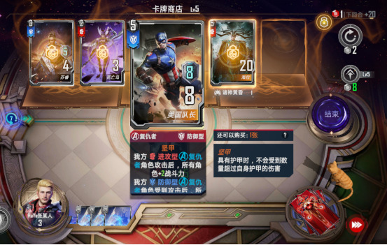 卡牌的过滤情况直接影响你胜率的20%甚至30%,什么意思呢,看下图,携带卡组中我只带了一张美国队长,如果我把这张美国队长买下来,然后刷新商店,那么商店不会在出现美国队长这张牌,这样可以大幅度提升你刷新到核心卡的概率。