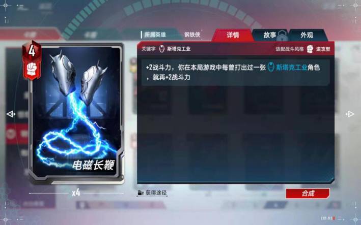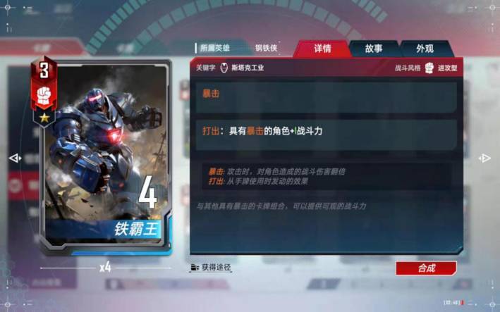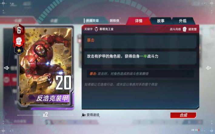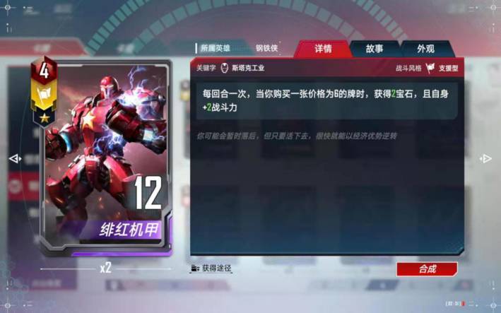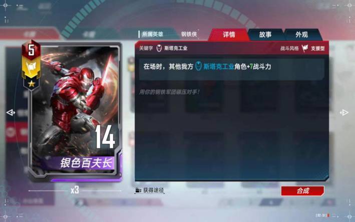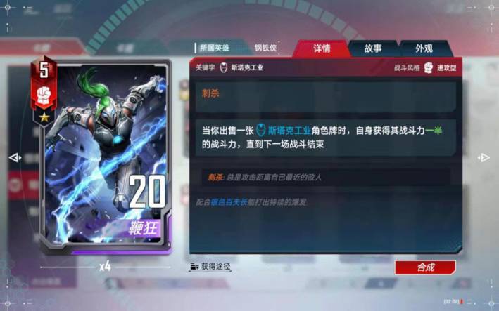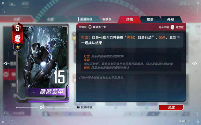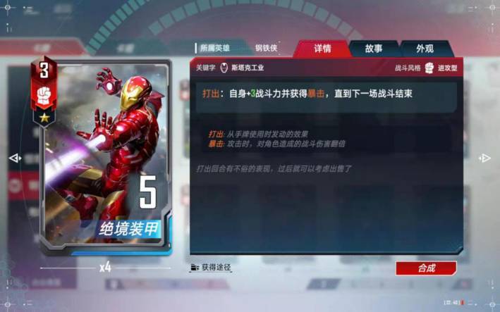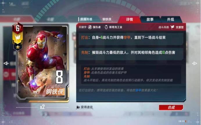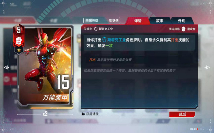 (5)、合成指南:想要玩【万能刺杀流】的,这张卡是核心之一,但是钢铁侠的尘肯定要优先留给“万能装甲”,这张卡还可以通过充值获赠,也可以通过合作模式(牌友模式)的尘购买得到,所以不建议合成。
