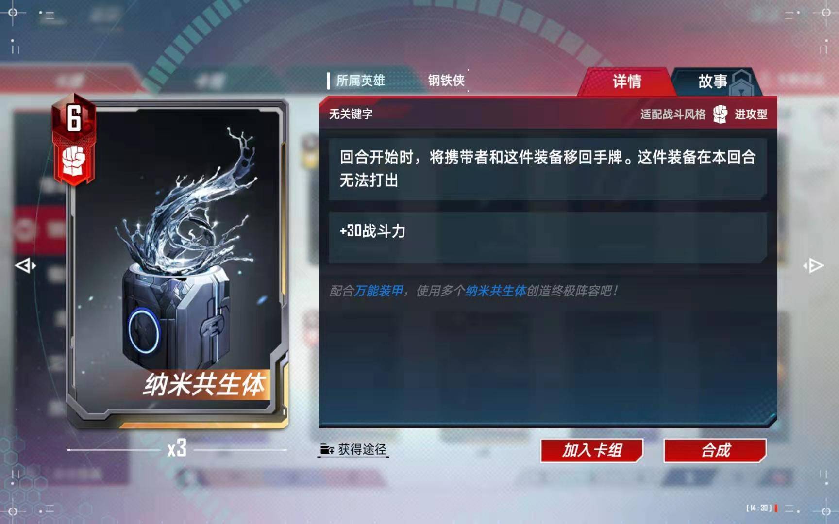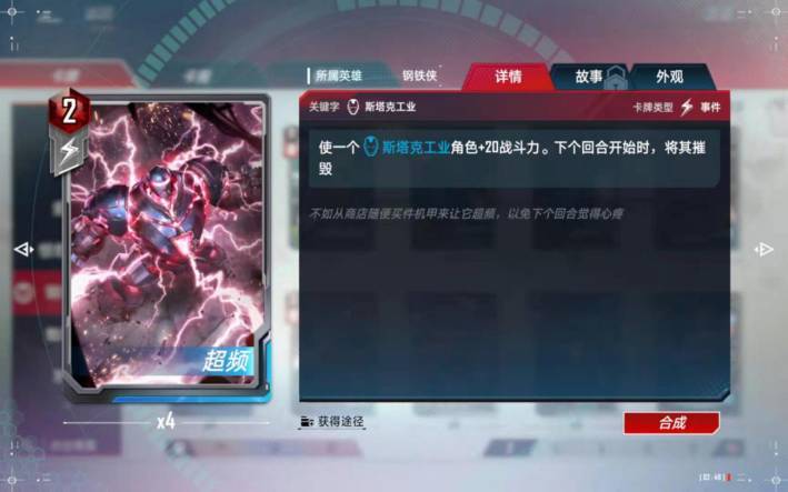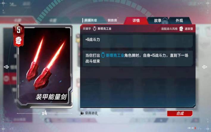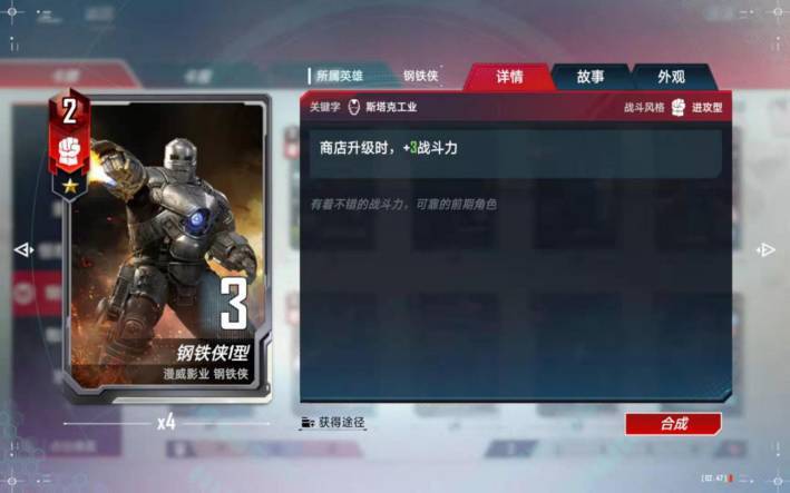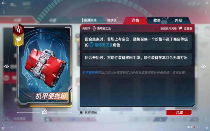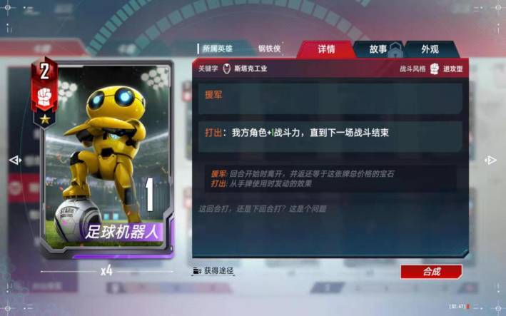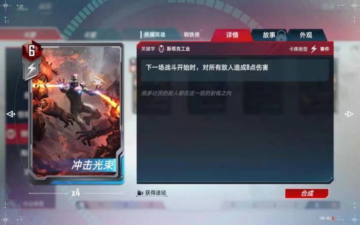 (5)、合成指南:想要玩【万能刺杀流】的,这张卡是核心之一,但是钢铁侠的尘肯定要优先留给“万能装甲”,这张卡还可以通过充值获赠,也可以通过合作模式(牌友模式)的尘购买得到,所以不建议合成。