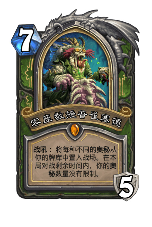 更新了猎人英雄卡:来自冰冠堡垒的外援,客座教授普崔赛德!(其实是没有可以做英雄的boss了),以及德鲁伊传说随从。同时重做了术士英雄收割者戈提克,调整了萨满英雄塔迪乌斯和潜行者英雄阿努布雷坎的强度。