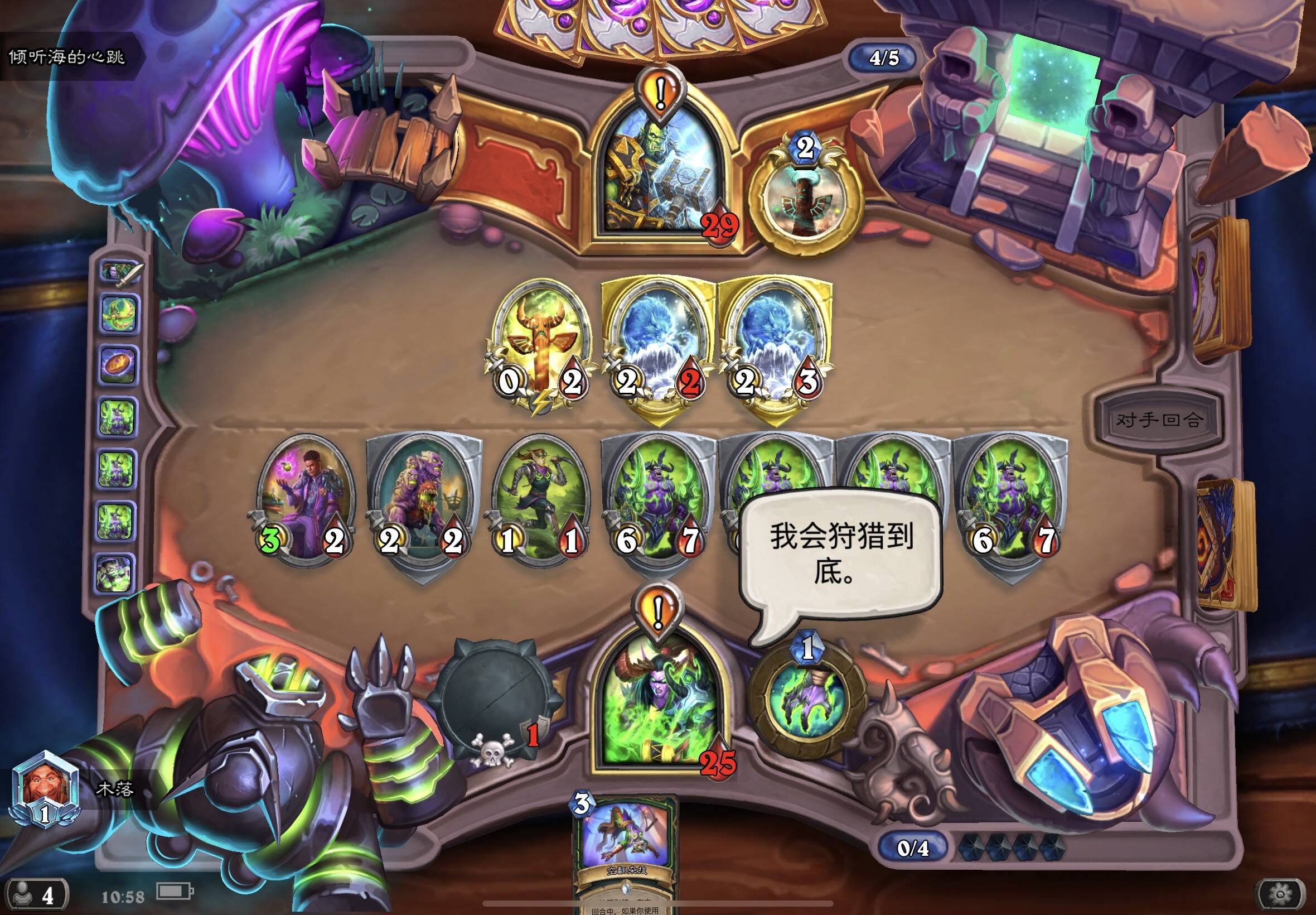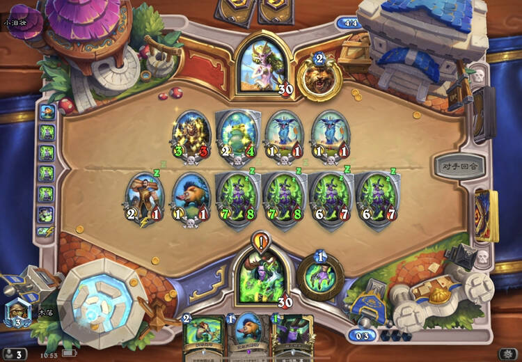 这两种猎人我们都是大优,只要做到4费准时启动铺场对面基本就很难处理了,对面buff过的76的狂踏的犀牛也只能跟我们一个怒缚蛮兵换掉,而且我们启动回合很早,4费基本还在20血左右,对面也很难用直伤怼死我们。