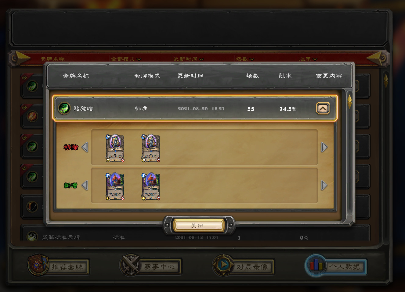 本人经过两天的缝缝补补,终于最后敲定了这套比较合适的瞎子卡组,并最终使用这套赌狗超生瞎成功打上传说,虽然在这个人均传说的时代,能上传说已经不能成为衡量卡组的标尺,但我还是很想把这套卡组拿出来和大家分享,这是一套充满刺激与绝望的新颖卡组,希望能够起到一个抛砖引玉的作用,也很欢迎各位瞎子大佬与我进行沟通与讨论。最终敲定的卡组打了55场,胜率有74.5%,之后我也会继续用这套卡组去上分,也欢迎大家去积极尝试这套新颖的卡组,提出宝贵的意见和建议。