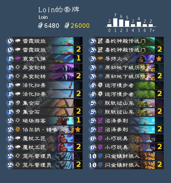 其实个人认为这种高度依靠组合的卡组起手留牌不会有明显的变化。异变轮转、小巧玩具、闪金镇豺狼人、笼斗管理员一般都必留,在此基础上,我还会留一些类似于集合石、魔杖工匠的前期小卡更顺滑的度过前期。