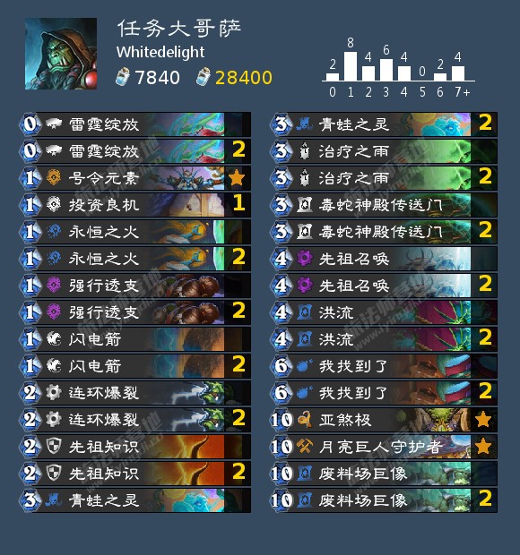 来自whitedelight14-4的战绩上至46名的任务大哥萨。任务体系与大哥体系的结合给予了卡组新的生命。在游戏早期利用过载牌处理场面,在游戏中期利用大哥站场蹭血量然后时刻准备运用手上的直伤完成斩杀。青蛙之灵与大哥体系在这套卡组中并不矛盾,蛙灵可以提前拍下用于过牌后再用先祖召唤/我找到了来召唤大哥上场。在牌序正常的情况下这套卡组的节奏非常不错,能够有效地遏制术士及牧师,他也在推特中称卡组将是打破环境的人而并非骗尘的垃圾卡组。卡齐的读者朋友们不妨尝试一下这套卡组。