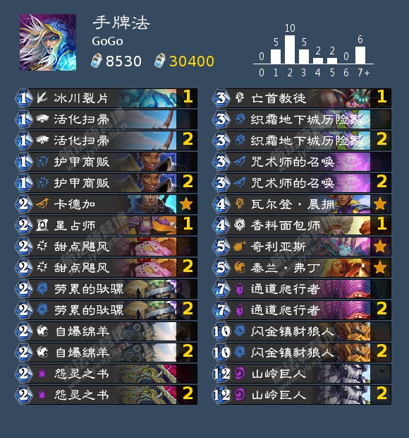 来自外服玩家GoGo登上传说使用的手牌法。相同思路的构筑要追溯到暗影崛起时代标准手牌龙法。UIS为我们带来了许许多多手牌体系的补强单卡,我们都将目光停留在了术士上,却忽略了拥有神卡咒术师的召唤,能够进行快速超展开的法师。虽然卡组是一套偏娱乐的卡组,但不得不说的是,在经历了甜点旋风以及劳累的驮骡这样优秀的手牌补充以及织霜地下城历险家这样定向抽取法术单卡的补强后,法师也有了玩手牌体系的资本。上分慎用,不过读者朋友们有兴趣的话可以一同回忆一下当时标准手牌龙法的感受。最后附上一张GoGo渡劫局后手三费超展开的图片。
