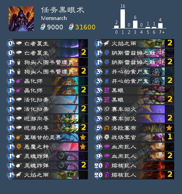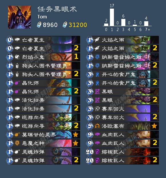 相较于国服,老外们还是更喜欢携带四张巨人以及洛欧塞布的任务黑眼术。Tom用第一套卡组完成登顶,Memnarch也用第二套卡组打到了第7。任务黑眼术最大的优势在于巨人+洛欧塞布带来的一锤定音效果,但很明显,卡组的快攻抗性要明显弱于国服盛行的任务疲劳术。外服玩家们更喜欢带上开心的食尸鬼来弥补做任务时的节奏。在AOE牌的选择上,外服玩家们更愿意选择能够触发黑眼特效的火焰之雨而并非国服常见的亵渎,在这一点的选择上主要取决于环境中二三巨头暗牧以及德鲁伊的数量分布,暗牧多则需要亵渎加持,德鲁伊多火焰之雨就更强大。黑眼和血肉巨人在挨了一刀后与补丁前在套牌中最大的表现差异仅仅是无法双黑眼同时站场开始水晶魔法,在牌序良好的情况下术士的平均做完任务以及巨人回合不会有急剧攀升的情况,晚一个回合是常态。这里推荐给大家上分使用。