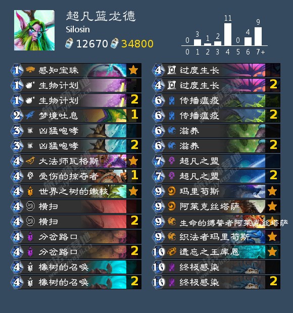 来自Silosin上至欧服17名的超凡蓝龙德。在法师逐渐销声匿迹,任务疲劳术出场率进一步上升后,超凡蓝龙德的最大绊脚石洛欧塞布和第二大绊脚石寒冰屏障全部从环境中消失,这令超凡德的登场率大涨并且进一步统一了超凡德的构筑体系均为玛里苟斯式的法术直伤OTK。Silosin选用的是携带双红龙双蓝龙补充伤害及手牌的构筑,其好处是能够使用梦境吐息加速过牌与跳费,但很明显的问题就是卡手。现国服常见的超凡蓝龙德的构筑形态可以默认为来自稚名丨想养只猫。仅携带了三个随从最大程度上追求超凡之盟后橡树的召唤的上限。奔逃的魔刃豹是当前超凡蓝龙德中非常重要的单卡,由于目前环境中缺乏有效处理潜行随从的手段,我们往往能够让它存活到7费,在开出超凡之盟的回合立刻进行后续操作。目前国服超凡德数量并不少,在内战之时起手就可以去寻找橡树的召唤以及双刀。在没有魔刃豹或者武器的加持下没有一方敢先手开出超凡之盟。超凡蓝龙德在面对术士时只要超凡之盟上手就占用极大优势,在此推荐大家在术士极多的分段选用超凡德抓术士。