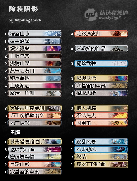 这让我想起我目前最喜欢的路拉斯套牌:除装阴影(Dress Shadow)。这是一个利用了褪除武装的格利级死亡阴影套牌。随着meta的自我演变,我非常喜欢这套牌,因为你经常会遇到一些意想不到的对局。所以一套有积极主动的游戏计划的套牌非常好。这是作者基于Aspiringspike所构筑的牌表:
