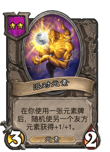 泥巴流的核心就是2星酒馆的派对元素和熔融岩石这两张元素牌(以下统称为核心元素)。一直停留在2本刷新酒馆,利用阿兰娜的技能,就可以拿到大量的这两张元素。等到合成出多个金色的派对元素和熔融岩石以后,每使用一张元素就可以使自己的战力稳定提升。在中期大部分人都在逛街找核心的时候,阿兰娜泥巴流能不断稳定提升随从身材,基本上是无敌的存在。虽然到后期泥巴流成长比不过拥有多个高本核心的成型阵容,但此时不胡的人基本都已经出局,阿兰娜已经至少烂分到手。要是剩下的人也都是苟烂分的阵容,那阿兰娜就有吃鸡的可能。即使过早遇到神仙,泥巴流扎实的身材也基本可以把对面场面换个七七八八,不太可能出现对面剩一堆高星怪导致30血直接被秒的情况,也就为进入烂分圈提供了充分的保障。