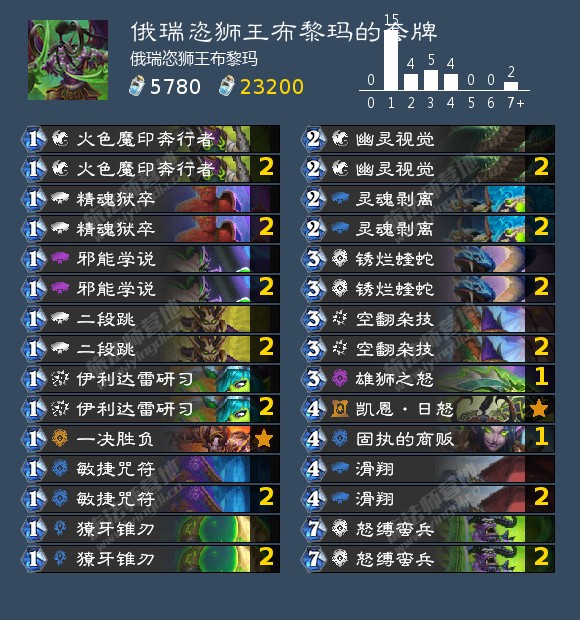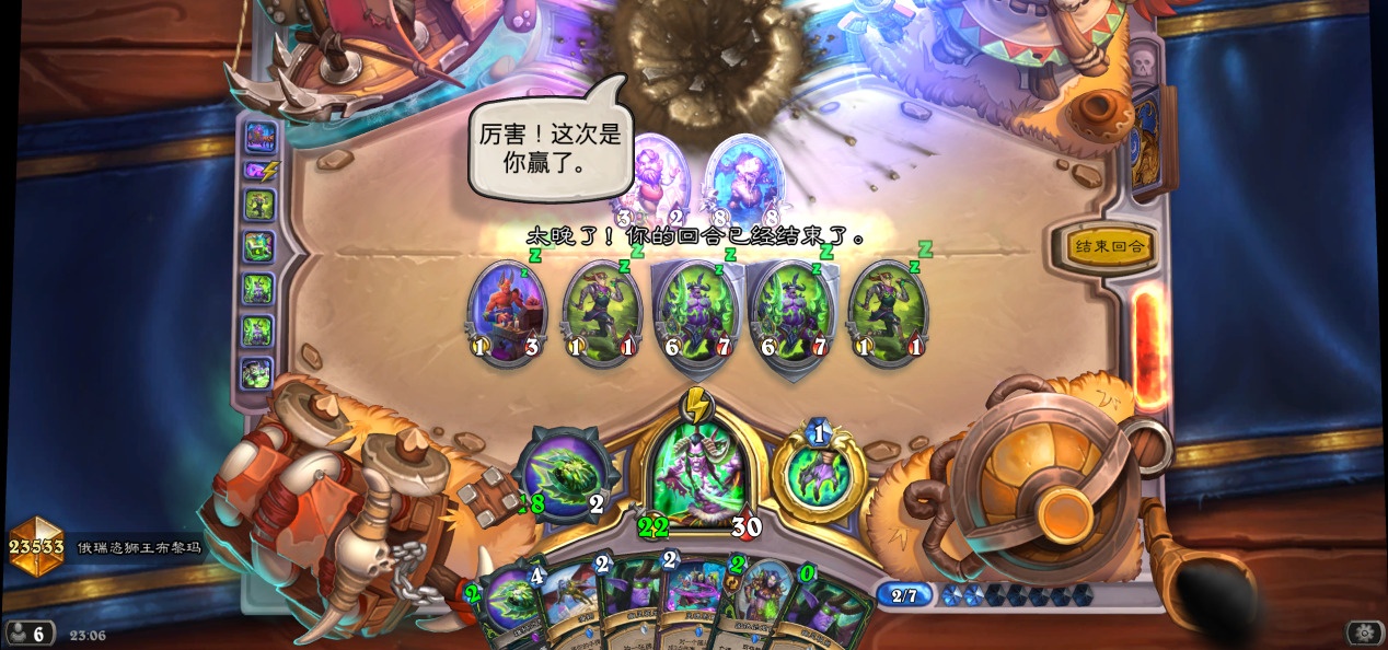六回合屠魔者,七回合开始过穿牌库找刀斩杀。过牌先打低费高效的,如果感觉伤害不够,就趁牌多的时候滑翔。残片的动画效果很慢,启动时千万不要犹豫,手机党注意操作时间。一般来说伤害在20点左右,过牌时把0费的残片牌打一打,之前没用完的邪能学说可以复制113来多堆点伤害。
