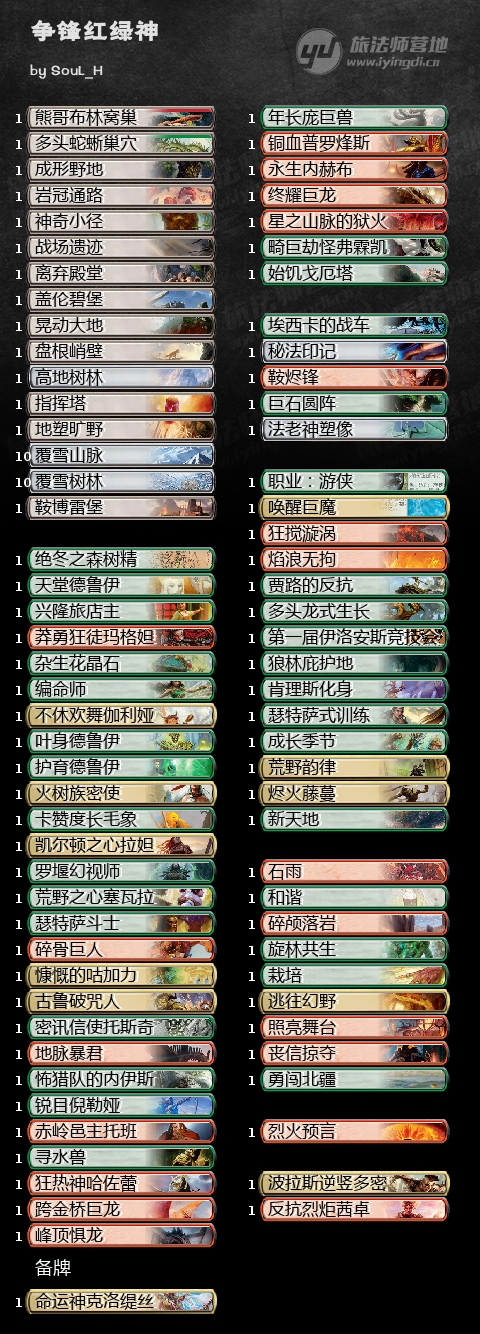 其实打法挺简单的,在优先ramp的情况下,尽早出红绿神,然后尝试结算威胁就好了。ramp完之后,如果对手是生物套牌多多少少我们比对手大一些,再加上还有红绿神的帮助,主动交换用红绿神蹭血也可以保证我们拥有主动权。而面对康康人或者去除密度高的套牌,不要害怕一换一,只要红绿神还在,一换一就等于可以多打对手4血(好像不能这么算)。而除此之外,见机行事就好,整套牌都是惊喜,戈厄塔进场打36在等着你!
