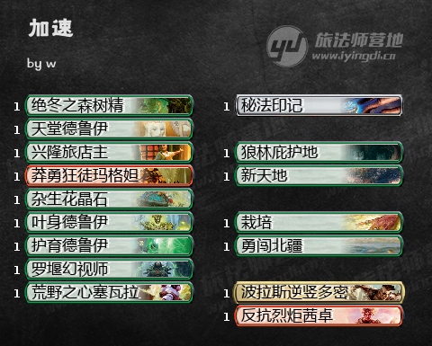 这套牌玩起来十分的有趣,虽然是一套猛袭套牌,但是有着出色的蹭血和站场能力,往往蹭个10点血就能锁定胜局。套牌的构成主要分为这几个方面:加速、献力/不灭生物(神)、结界、蹭血、赚。后面我来一一说明。