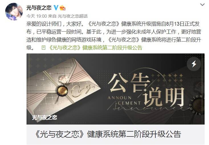 《光与夜之恋》健康系统升级措施自8月13日正式发布,已平稳运营一段时间。基于此,为进一步强化未成年人保护工作,更好地营造和维护绿色健康的网络游戏环境,《光与夜之恋》健康系统将进行第二阶段升级。