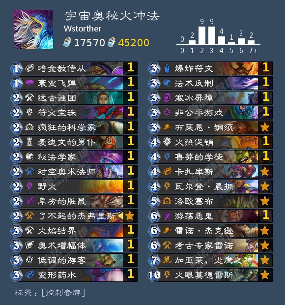 P.S.评论区下面有老哥对这套牌有误解,我在这里说明一下这套牌较其他传统控制卡组的优势。正常的控制都是在自己本回合中去解对手上一手出的牌,或者去拉出对手OTK的组件。而这套牌不但因为火冲体系和小解较多使它在自己回合内能有效控场,而且可以因为奥秘的存在而在对面的回合也能有效控场,适当地利用好奥秘,就可以在某些关键时刻破坏对手的思路。(比如法反破对面嗜血咆哮恩典鱼勇可贾或者橡树召唤,爆炸变羊破哀绿豹子等等,只要你前期不出侍从和男仆,别人一定会以为你是奶粉那套宇宙火冲法而不防奥秘)而且龙鹰之神和火眼的存在也给了这套牌打同类型较薄控制的能力。(专业暴打同行)