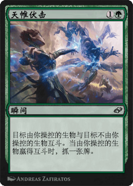 天帷伏击这牌很有趣。目前史迹里最常用的互斗是暴雪争斗和原初之力。二者各所长,暴雪争斗可以膨胀生物还给不灭,原初之力前期当解后期还可以变大哥。我不能说天帷伏击比这两个哪个更好,但我确实觉得平起平坐应该差不多。两费是个不小的缺陷,但是瞬间时机的互斗可以铸就一些高光时刻,而且赢得互斗后抓张牌实在是太厉害了。