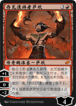 西瓦漫游者萨坎大抵能在五色龙里找到自己的位置,因为他的加豆技能是很无脑的加速和调色来源,可但是,史迹龙套牌里已经有很多加速牌了,比如说炎血萨坎和巨龙宝库已经最近出现的龙珠,这几个都比新萨坎费更低,而且不像萨坎一样要亏手牌或者在史迹赛制里施放西瓦巨龙。我认为西瓦漫游者萨坎应该会在五色龙里有一席之地,但是满编不太可能。