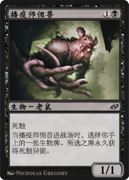 播疫师佣兽在这个排名里位置相对高到原因只有一个,我们已经见识过一个有死触的舞链鬼怪在正确的对局里大杀四方了,播疫师佣兽提供了一个很平滑的手段来给手里的RRR死触,这样就不必走“拍出来,让它死掉,然后用夺命狮召唤把它从坟场捞回来”这样看起来很蠢的老路了。除了能和舞链鬼怪搭配(或者类似的组合技)之外,我觉得这个小老鼠不能算是张好牌,不过它的的确确可以在正确的构筑中发挥很强的作用。