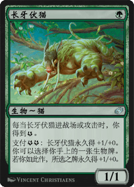 长牙伏猫是一张很有趣是牌。能量快攻类套牌自从卡拉德许重铸以来就不是一个很强的套路,它不厉害的最大的症结在于没有特别合适的一费曲线。长牙伏猫可以治好一费曲线的毛病,在提供提供一费曲线的同时还能支持滚雪球效应这样的套牌主题。如果能量快攻真的出现在史迹里,那么这只猫就是原因本因了。而且我觉得它应该不只是出现在 能量快攻里。试想2回合它是一个草原雄狮还能恒久让手里一个生物大一圈,而且几个回合后(如果能活到那个时候的话)还会变得更大。另一种情形,一回合拍长牙追猎者,然后二回合踢一脚给手里像狼人群首领这样的两费曲线膨胀一下,就问问对面的后背凉不凉?