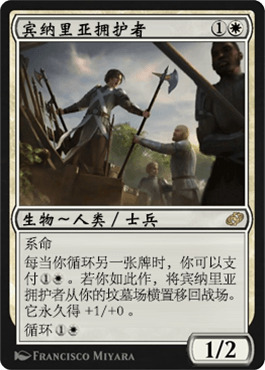 至于宾纳里亚拥护者,我觉得循环类套牌应该是他在构筑中的容身之所,尽管我自己也有点不太确定。两费循环是一个缺陷(构筑里大多数循环是一费)。虽然能够从坟场爬回来这样能力可以说是对清场和去除的抗性十足,但是第一次回场不过是个2/2熊。另一个问题:循环类套牌基本都是围绕晶顶闪光进行构筑的,这导致对手在换备时会带上各种坟场仇恨,对上得享安息和虚空地脉这样的牌,2费生拍一个1/2的拥护者就显得很疲软了。