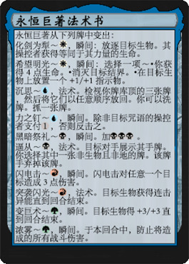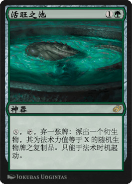 最后我们聊聊永恒巨著和活旺之池这两张牌。这两张都是一眼看上去很强但是收益极其不稳定的牌,所以也不太好评价。简单来说永恒巨著是一个每回合支付一费可以抓一张的三费神器,感觉起来似乎还不错。但问题是虽然这本书提供的是万智牌史上强力的一费法术合集,但这个合集很诡异,而且谁也不知道会抽到哪个牌。这样有时候满心欢喜的启动异能但是最终得到的可能是完全没用的牌(比如说无生物控制里来一个突袭闪光,快攻想补伤害结果来个浓雾)大家试想一张不能对于推进比赛进度有帮助的牌还能算是牌吗?我估计这本大厚书的强度足以让牌手尝试去驾驭它,但是它最终是否可以留在套牌里仍有待观察。