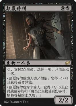 颠覆侍僧是史迹新篇里最正常的一张电子独占单卡,一个2费2/2没什么大不了的,但是支两费变成3/4系命或者是5/5的非瑞克西亚绝灭兽就非常的灵活。对抗快攻,罗克战僧不是那么容易被处理掉,而对白蓝控制,非瑞克西亚绝灭兽基本不会被造成伤害,2回合开始打5实在是太凶了。而且死亡阴影和空境祸害套牌对于支付生命作为费用的牌更是双手欢迎。但是关于此牌最大的问题是像小黑快这样的套牌要把什么替出去才能让颠覆侍僧上场。他比空境阴魂强吗?比破坏魔后裔强吗?我觉得够呛。他应该在黑色献力类的套牌里大量使用,当然,这是因为他BB的费用的缘故。