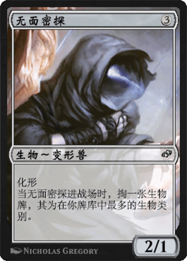 无面密探是一个不太好评价的牌,很大程度上因为他有潜力进很多构筑(基本上是能力不足的部族套牌)但是又不能说是标志单卡。 三费2/1掏个生物就算不惊艳但是也还行,但是他可以从任意部族联动中获益才是重点。我对于他的猜测是他会出现在各种低梯队的部族套牌里,或许也能进一些排名靠前的部族套牌里。好消息是他是个铁牌,在史迹新篇的很多主题里都有,打几把限制赛就有一堆了。(译者注:一个铁你叭叭半天)