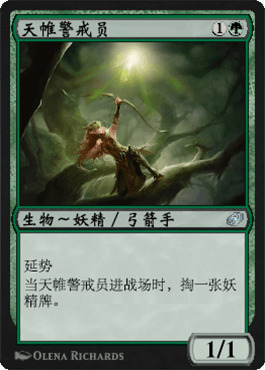 天帷警戒员和妖精幻视师相比是个补强,因此她可能在妖精套牌里出现。但问题是现在的妖精思路里我们基本不带幻视师,所以考虑到这层,天帷警戒员也许就不太能找到自己的位置了,尽管她挺value的。
