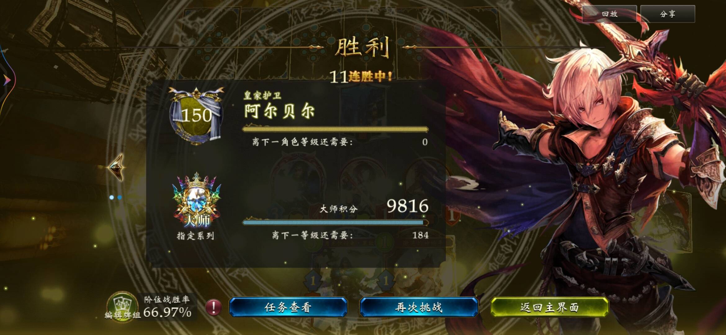 双方卡组都偏抢血,而我们的抢血能力明显强于对手,在激奏妖普遍放弃天香剑士·卢梵的大环境下,这一优势更加放大。