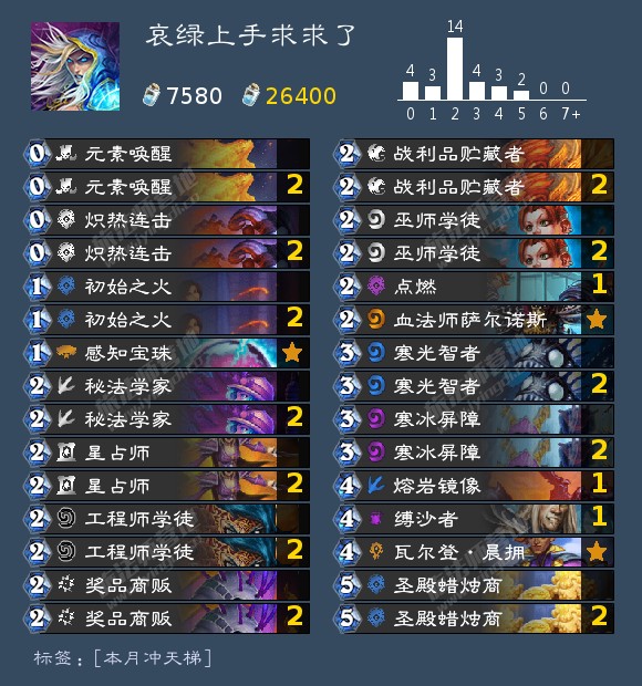 可替换卡位:血法师(穷逼可以不用,但这个真心好用),魔杖窃贼,感知宝珠(绝对的舒服好用),晨拥(随从冰环,第三个冰箱)