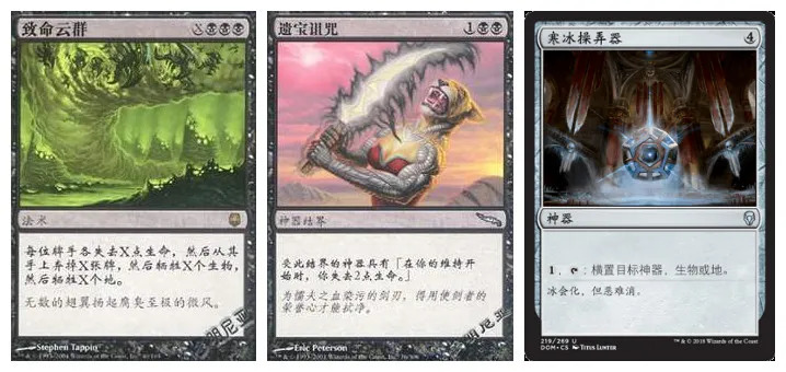 我抓出了一套致命云群控制套牌,依靠寒冰操弄器来拖延时间,用遗宝诅咒来斩杀对面。这套牌很怪,但是我就是很喜欢这种风格(如今依然如此),这套牌最终打了2-1。第二场轮抓我还是2-1,然后就进了Day2!