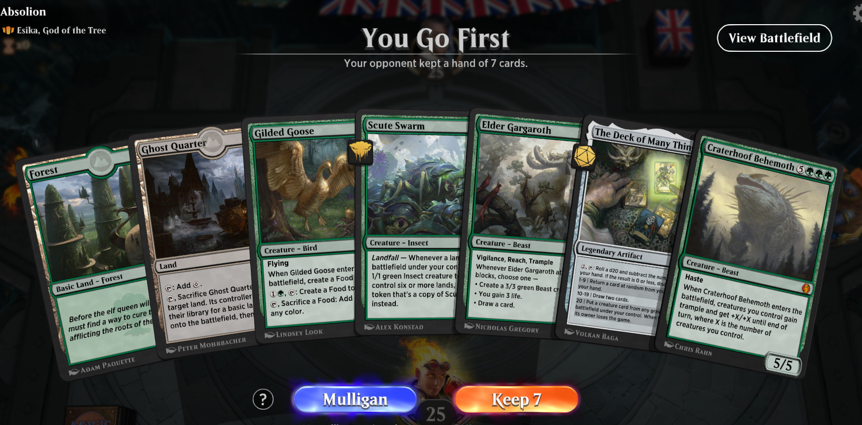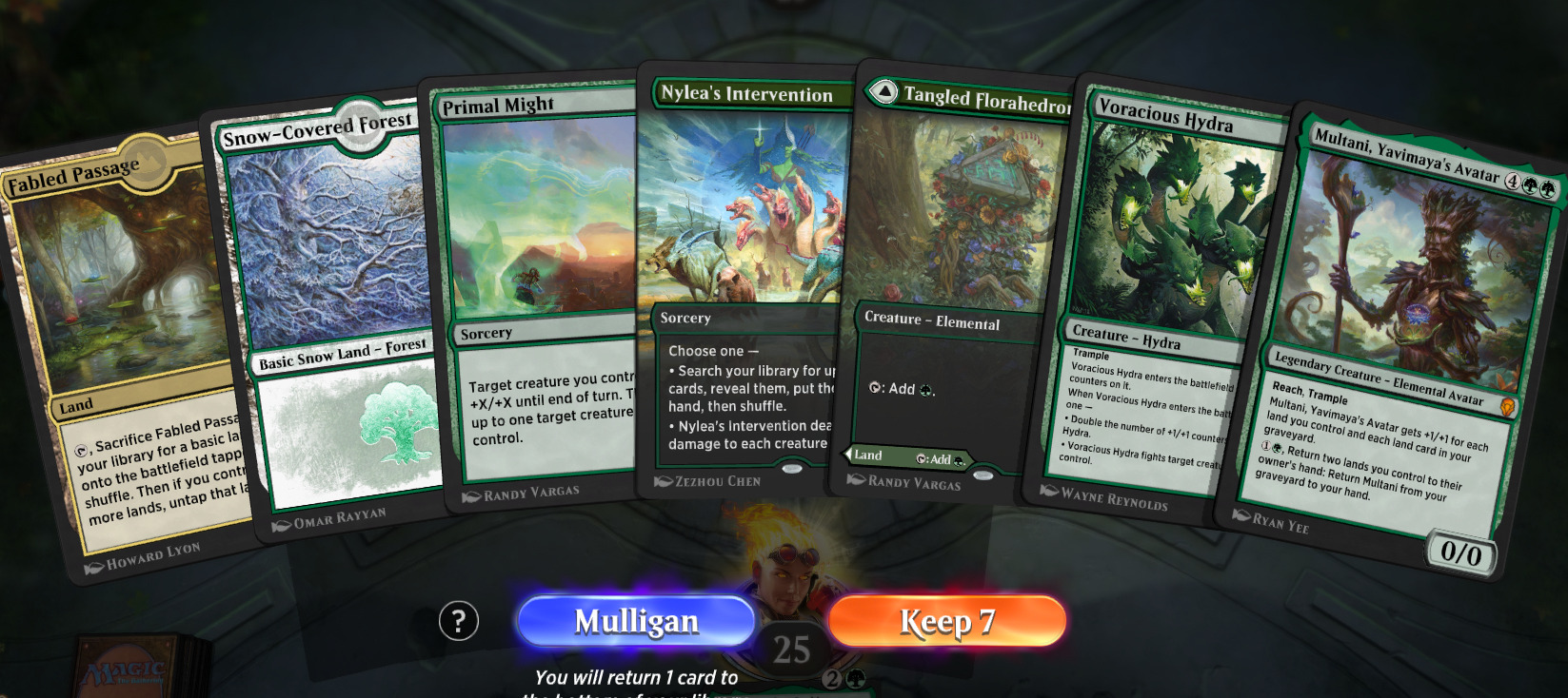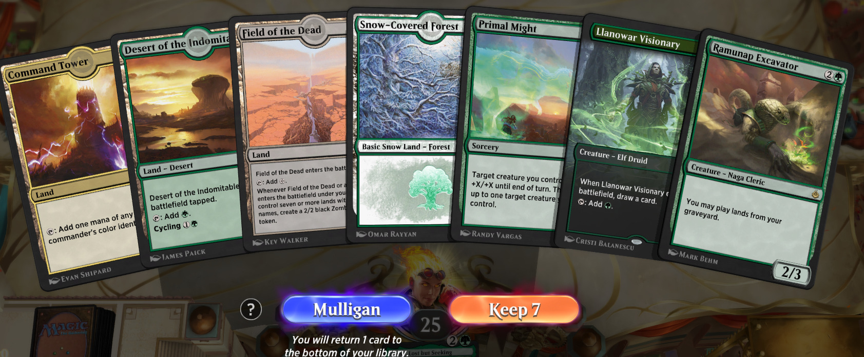 总的来说梓莎的ramp还是以1跳3和找地上手为主,搭配一些能够从牌库顶或坟墓下地的工具人,这些都是起手留牌应该注意的。顺利下地是前期展开的根本保障,后期的慕达雅先知能够过滤牌库顶的地,世间锤炼和锤炼人都可以多次利用功能地。但由于主将本身不赚,且地的比例较高,偶尔还是会爆地。