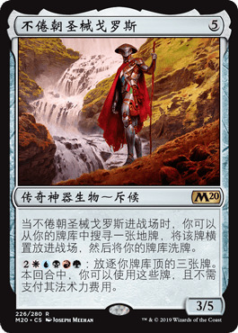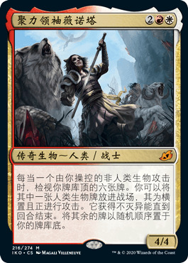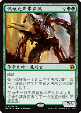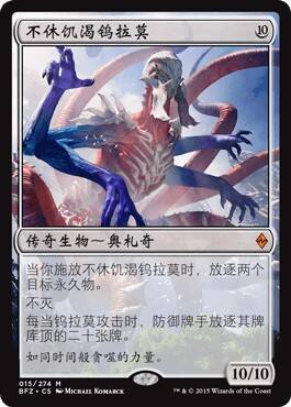 厉害威胁(拍下来对面解决不了很恶心):饥饿之声弗霖凯(锁对面费用)、荆棘长毛象(打小生物套核心)、庞巨猿猴寇格拉(猩猩哥能回手主将躲去除,能杀生物、能去除神器结界,未免太万能了)、畸巨劫怪弗霖凯(能配合旅法,锁对面传记)、能干的旅法们(撼世妮莎、生机妮莎、薇薇安瑞德、休论乌金)。其中生机妮莎加豆直接开大,不用贪-3回手。