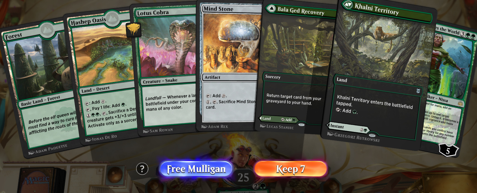 总的来说,我觉得起手牌的重要性是:地>加速>填充物>=威胁>>>去除。对于梓莎来说地的重要性是毋庸置疑的。主将出来后每回合只能下1个地甚至卡地就傻的不行。加速用来保障威胁能够顺利拍出,其中最好的加速是罗堰妖精、妮莎得胜和莲花眼镜蛇。最差的加速是探索大地,正在考虑是否要优化掉(已经优化掉了)。