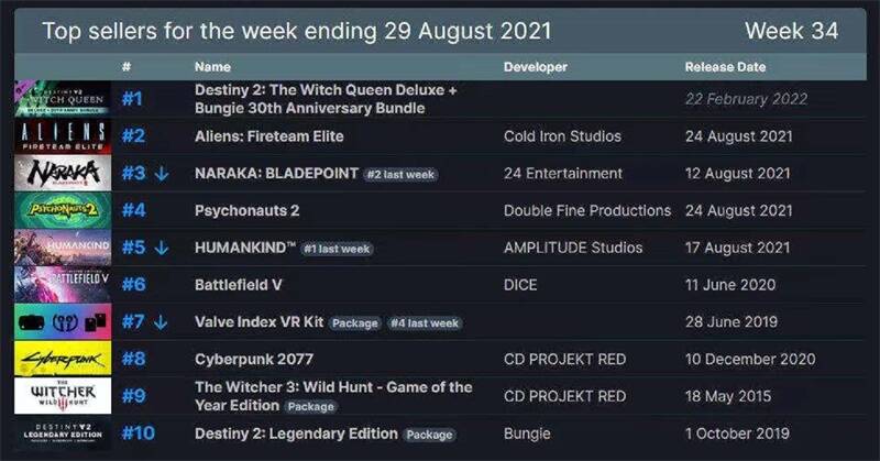 此外,《命运2》全新DLC邪姬魅影豪华版+Bungie30周年纪念组合包,也在8月23日~8月29日期间成功登顶Steam销量排行榜,向外界充分展现了游戏强大的生命力!