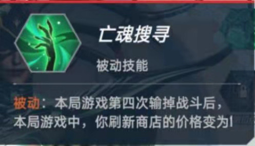 被动技能,本局游戏第四次输掉战斗后,本局游戏中,你刷新商店的价格变为1。