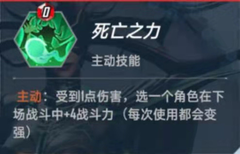 主动技能:收到一点伤害,选一个角色在下场战斗中+4战斗力,可以叠加,每次使用都会变强。
