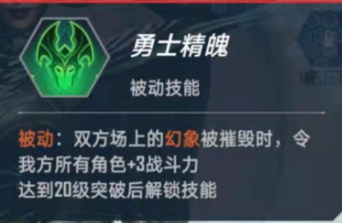 被动技能,双方场上的幻象被摧毁时,令我方所有角色+3战斗力。