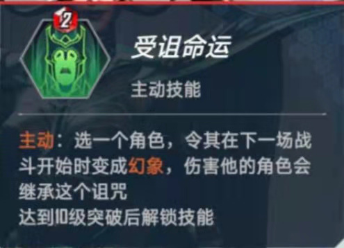 主动,选一个角色,令其在下一场战斗开始时,变成幻象,伤害他的角色会继承这个诅咒。