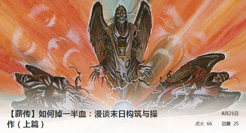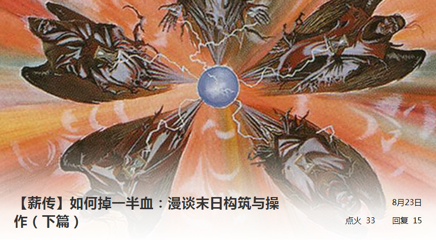 极力推荐由北京薪传牌手苏克创作的末日组合技套牌攻略,超级大干货!文章分两部分,上篇讲解了套牌构组和单卡选择,下篇讲解了如何使用末日,内容非常详细。无论是想玩好这套牌的末日玩家,还是想战胜这套牌的其他玩家,我都推荐去看一看,点击跳转:上篇 下篇