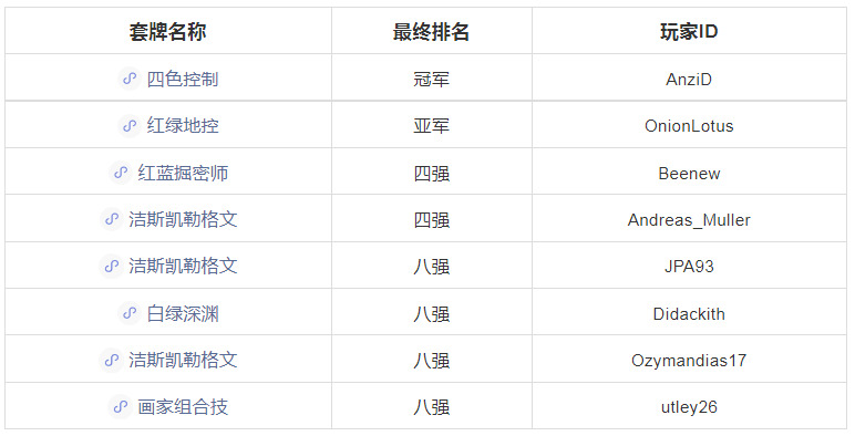 红蓝掘密师的占比再度遥遥领先,其胜率继续保持在50%。另外洁斯凯勒格文、地控、白绿深渊、妖精在这次比赛中表现较好。偷袭教诲的占比排第二,但表现非常糟糕。下面是比赛的八强套牌