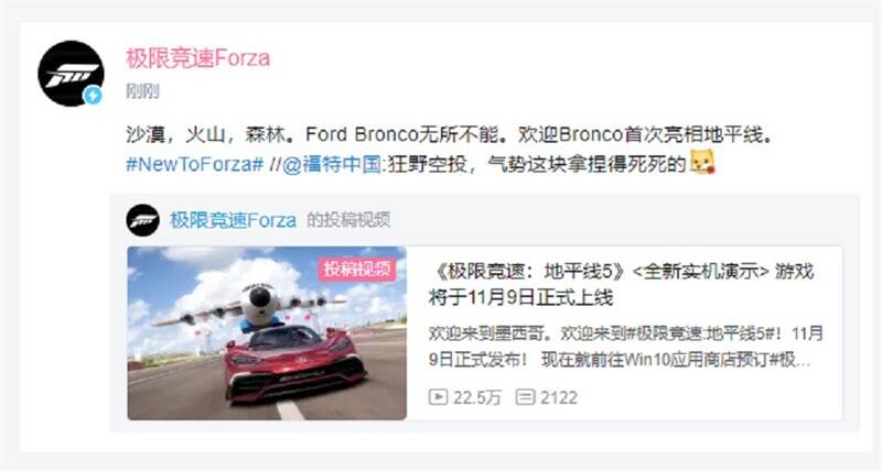 在《极限竞速:地平线5》发布封面车辆以及展现游戏实机演示视频后不久,它的B站官方号评论区就出现了一位意想不到的“客人”。福特中国官方号亮相评论区,为福特Bronco点赞,并评论游戏实机画面中致敬《速度与激情》的片段为“狂野空投,气势这块拿捏得死死的”。为此,《极限竞速:地平线5》也点赞福特Bronco在沙漠、火山、森林等不同地形中,都有出众的表现。