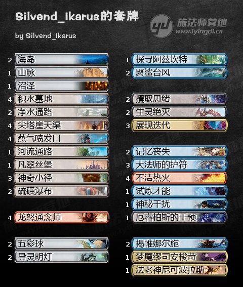 除了大法师的护符,我还用了其他反击咒语,记忆丧失是很多套牌的选择,也可能是史迹二费康最优选,当对面卡地的时候你就爽吧;一张神秘干扰主要是为了解决上面提到的有关展现迭代的问题,当我们三回合被迫迭代时,还能有机会用一费反击对方的蓝色咒语;试炼才能用的人不多,但我却非常喜欢它,因为它对抗提勃的诈术、征召军伍、米捷兹的精研、最新的达夫黎的凋灵术、以及对手的反击咒语都有非常好的效果。