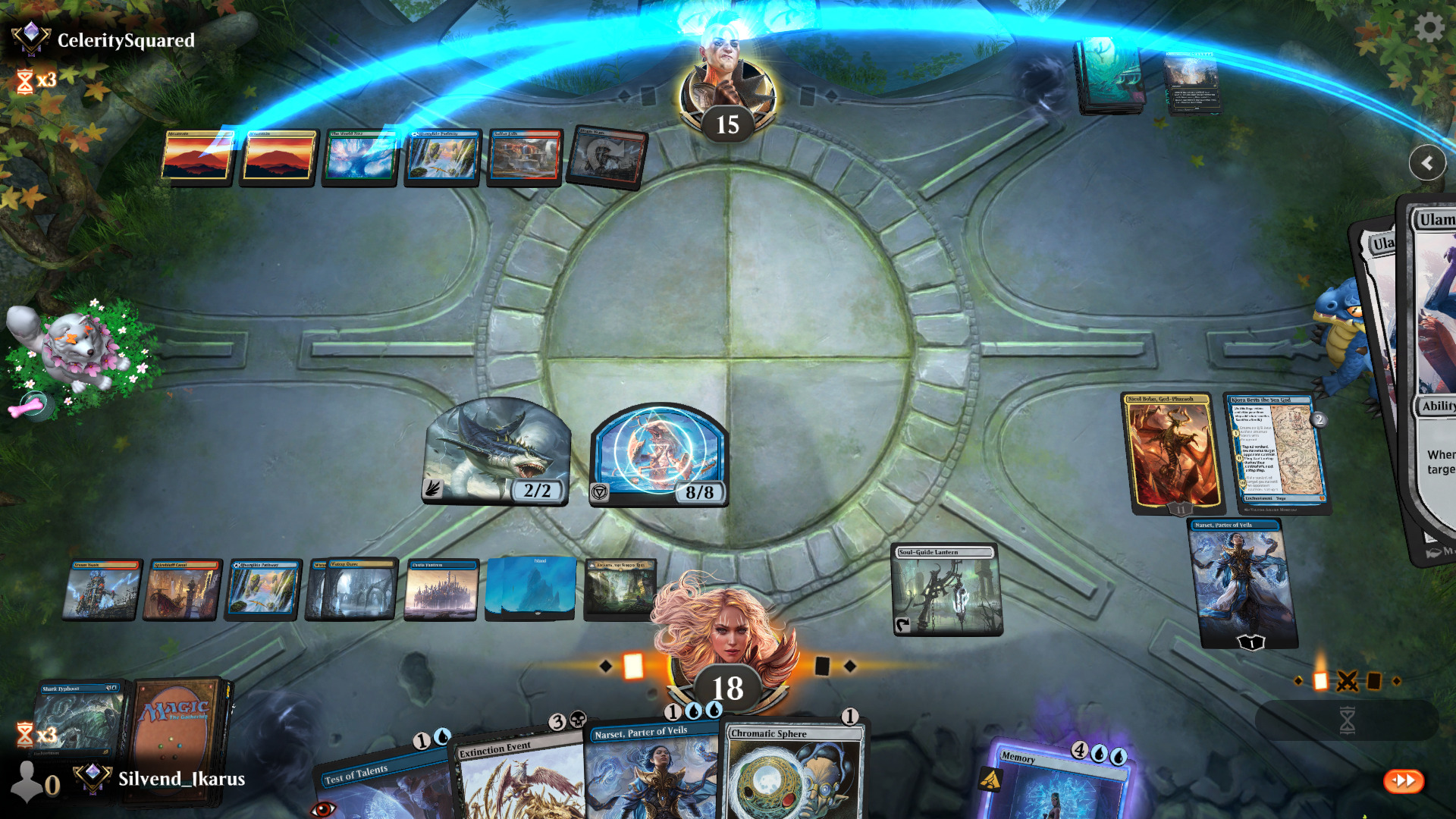 寄托//记忆不仅算康,而且也可以去除一些难解的威胁(比如格利极色比较难解的结界肃然致哀等)。考虑到这套牌的威胁可能还是有一些少,利用记忆那半边再来一次也是常有的情况(可以配合揭帷娜尔施进行常见的我抓7你抓1操作,也可以配合导灵明灯有效削减对方剩余的威胁数量)。