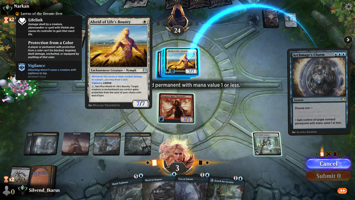 梦魇缪司安梭苛在我们能够接管局势后表现非凡,在去除难以针对的永久物时也有良好的表现(比如已经结算的肃然致哀等常见结界)。在她之前我曾在这个位置放了龙尊尼可波拉斯,但实际上由于颜色很难调整,它最终被我放弃了。