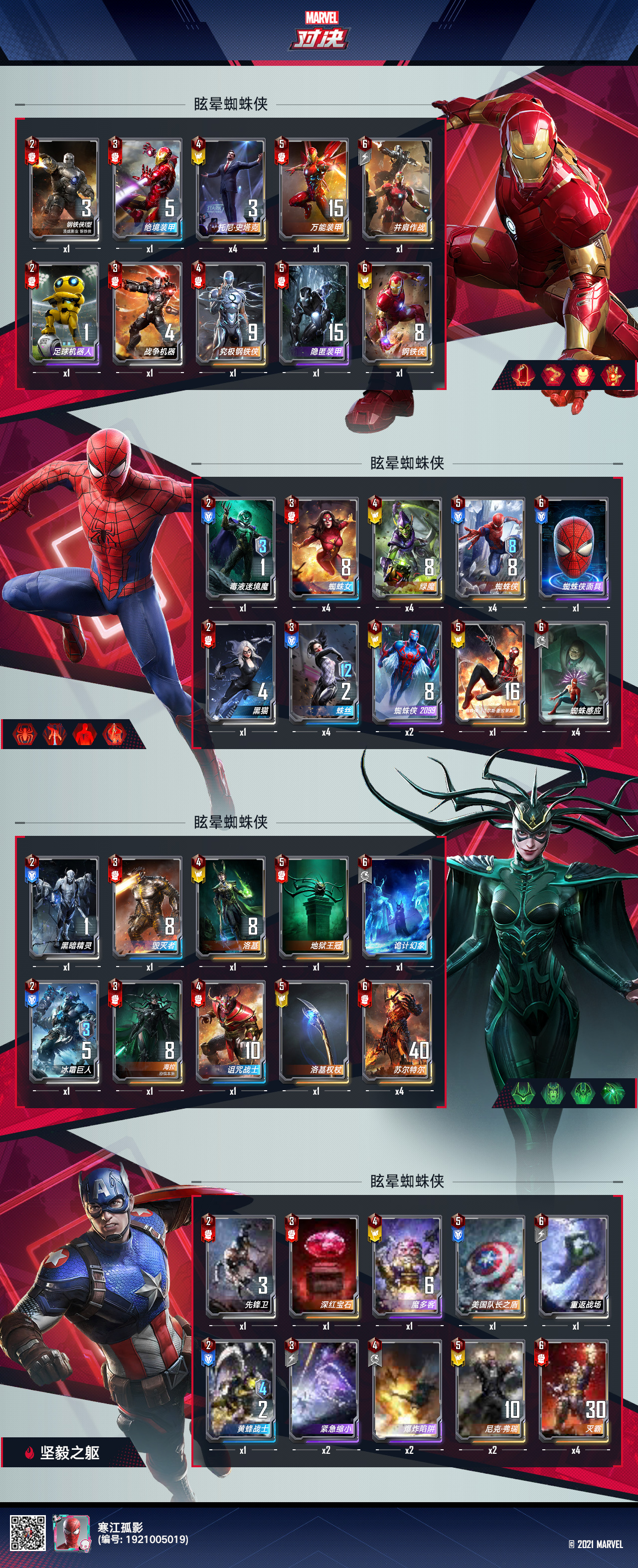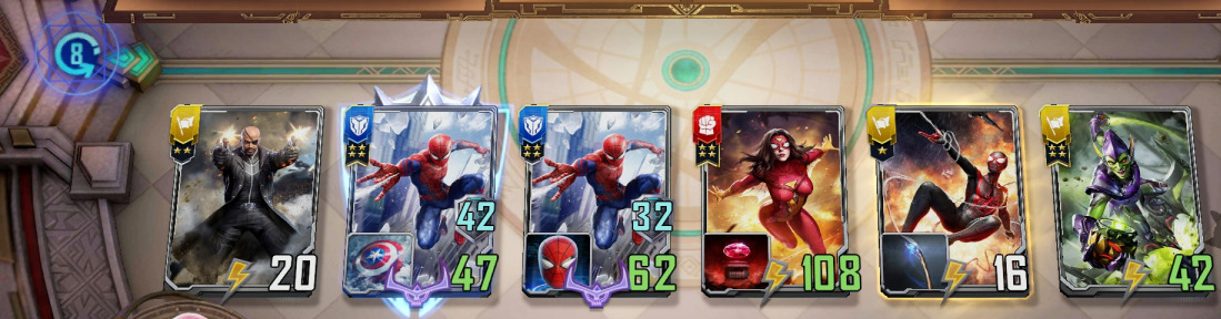 6. 如果对手是惊队,【蜘蛛侠】和【绿魔】放前面,核心卡后置,优先送死然后【蜘蛛女】收割;如果对手是复联或万能,找一下【爆炸陷阱】和【蜘蛛感应】应对,【迈尔斯】在场完全不虚;注意防一下独行【苏尔特尔】,找【钢铁侠】应对;遇到成型灭霸套娃,这鸡就让他吃了吧!