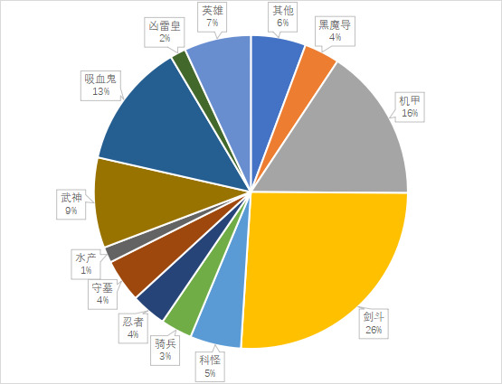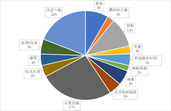 接下来是技能分布图。可以看到注定一抽,心灵扫描和控制占了半壁江山。大家使用的角色基本就是贝加索斯,暗游戏和基斯。其他角色使用较少,偶尔看到光头利息德和孔雀舞。心灵扫描剑斗兽非常强劲。内战时可看对方有没有战车,外战时可根据对方后场选择战略。注定一抽配合同胞的羁绊这个卡做到一回合爆展和触发技能非常无敌。完美配合武神卡组。吸血鬼现在一般都会用控制去牛对方后场otk,也许以后也会慢慢流行放马过来牛前场?毕竟发动条件相对简单。