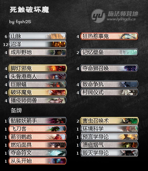 史迹里有大量的神奇配合,都被一线卡组的光芒掩盖了。但新卡播疫师佣兽,加破坏魔鬼的配合终于得以在银铁赛制展现。若不是鼎镬佣兽被禁,卡组的威力还能再上一个台阶。破坏魔鬼一旦配上死触,其威力足以消灭大部分生物卡组,无论是牺牲成形野地还是珍宝都能触发破坏魔鬼的死亡一指。只有辟邪贴皮可能幸免。但我们也有Plan B,可以靠记忆堡垒赢。