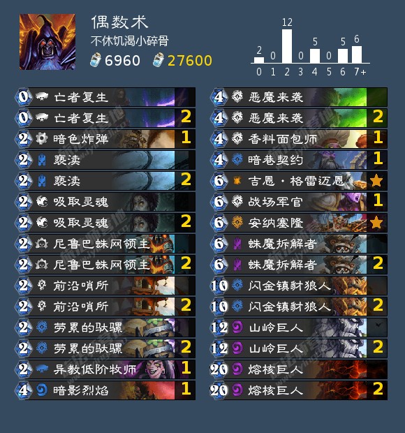 因为我一般默认对手玩任务术,留牌会偏薄。对手确实有很多是玩任务术的,但是有时候对面会突然掏出偶数术,而对手基本知道有个名字什么什么碎骨的,是玩偶数术的,这导致我内战很难受,目前内战有12局,输了3局,并非显摆,我认为我投入到这套卡组的心血很多,内战战绩理应更出彩一点。