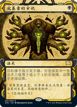 强度极高的一张牌,也是玛尔都控制本次获得的最大利好。这张牌成功躁狂的话就是个威胁。重要的是,即使没能躁狂(比如对方换出了坟场针对),配合我们海量的非生物牌它也是我们的核心。疯狂的刺探找牌极大提高了我们的稳定性,同时还附送填坟,这一切只要一点红就能做到。在此牌加入之前,因为解和威胁的不对称问题,玛尔都控制充其量只能是个三四线牌,这一张卡**扭转了局势。同时加入的卡还有同属躁狂的离谱烧牌不洁热火,其本身是个勉强合格的解,躁狂之后更是能一发烧死几乎全部生物与鹏洛克的终极赖卡。在我们的套牌里,地/生物/鹏洛克/法术/瞬间/神器都有发挥,不遇到坟场针对凑齐躁狂并不困难。故此笔者选用4张不洁热火,完全放弃了少有超出热火表现得送终一击。